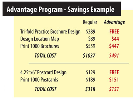 Design charges for all regular tri-fold brochures, postcards, business cards, referral cards and dental report cards are done at NO CHARGE. Design charges for all other projects, such as four-panel brochures, puppy booklets, pet health records, clinic forms, wellness report cards and optional services receive a 50% DISCOUNT off our regular design fee.
